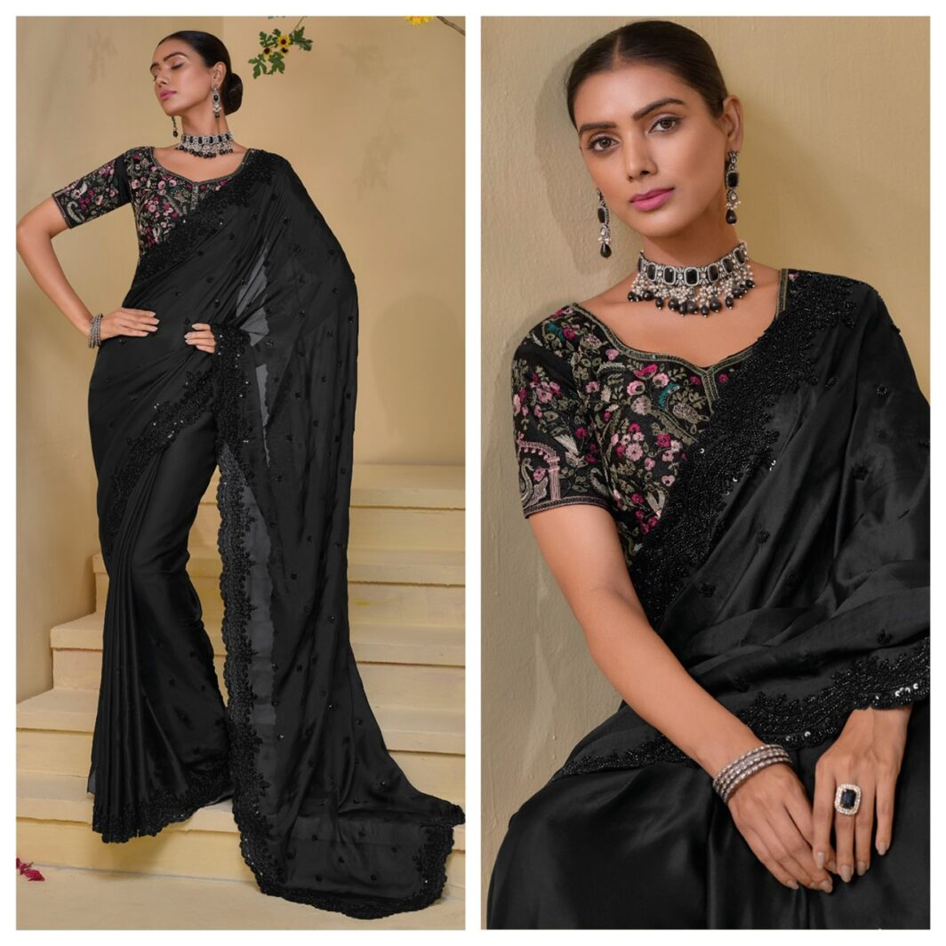 BLACK PURE BANARASI TUSCANY SAREE WITH CUT-DANA, MOTI AND SEQUENCE HEAVY WORK
