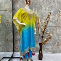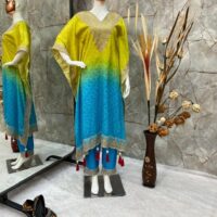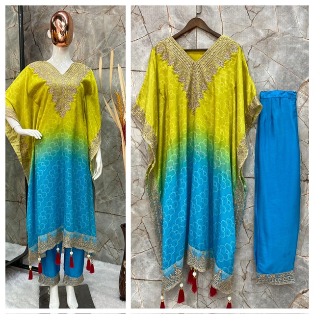 New Bollywood wardrobe team ready made chinnon bandhani kaftan suit