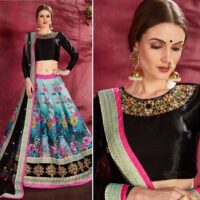 New designer multi colour Bangalori silk lehenga with floral print, sequin and zari work – blouse has heavy neck jewellery embroidery
