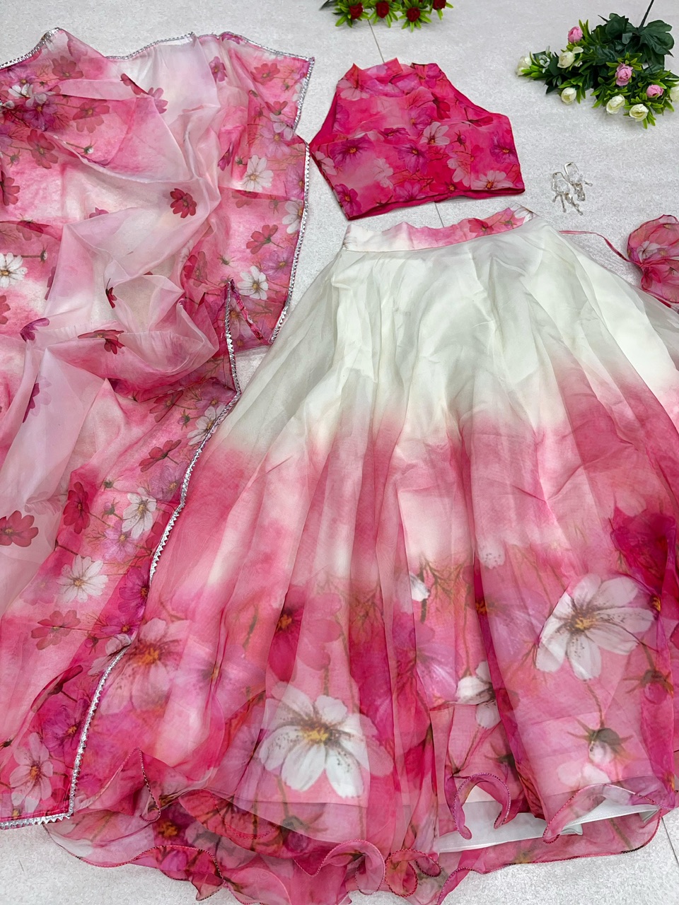 New Bollywood wardrobe team ready made organza silk digital printed floral lehenga