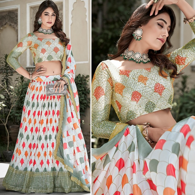 New designer crush chinon digital printed lehenga with sequin work and cancan inner