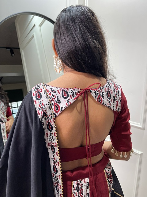 Skirts stitched max 42 inches inches waist and blouse stitched 38 inches chest with inside margin opens to 42 inches (also can be taken in from the sides by a tailor)