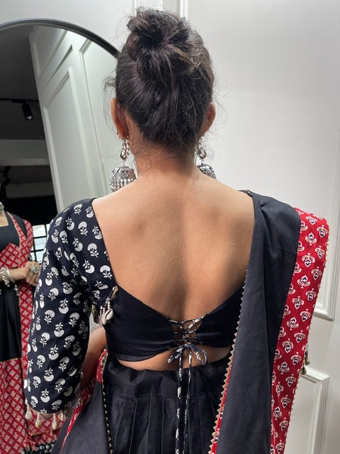 Skirts stitched max 42 inches inches waist and blouse stitched 38 inches chest with inside margin opens to 42 inches (also can be taken in from the sides by a tailor)