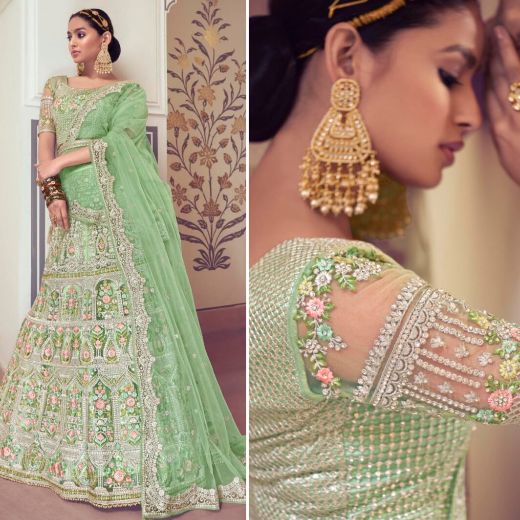 New designer premium net lily green colour lehenga with zari and zarkhan embroidery – belt included