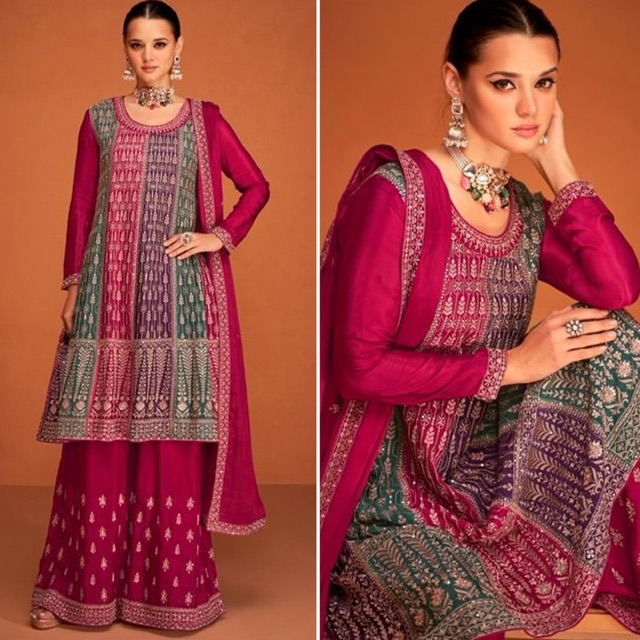 New designer free size stitched chinon silk suits with embroidery work
