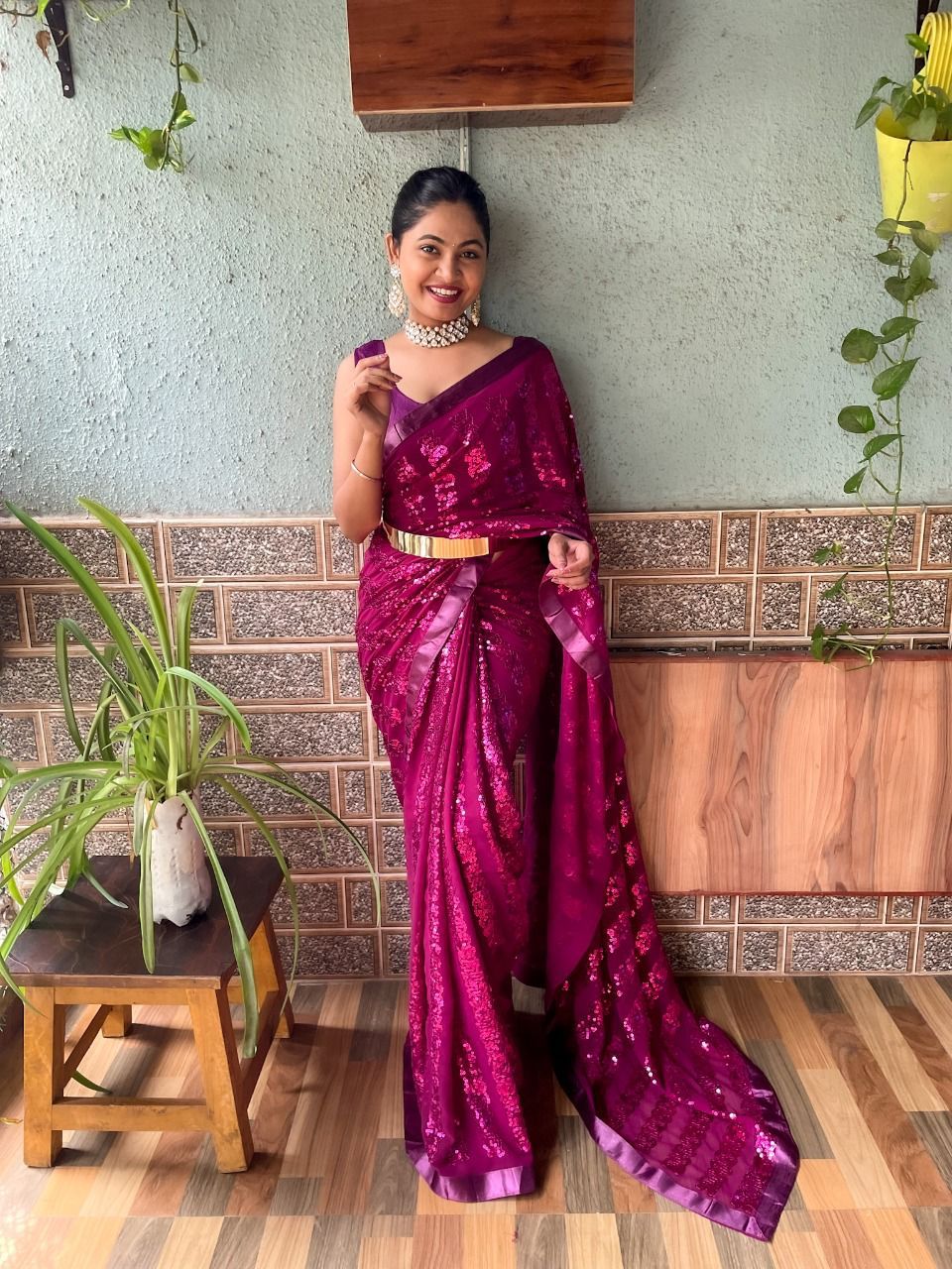 New Bollywood wardrobe team ready to wear Georgette sequin saree with belt and unstitched blouse (WhatsApp 07545098986 for video)