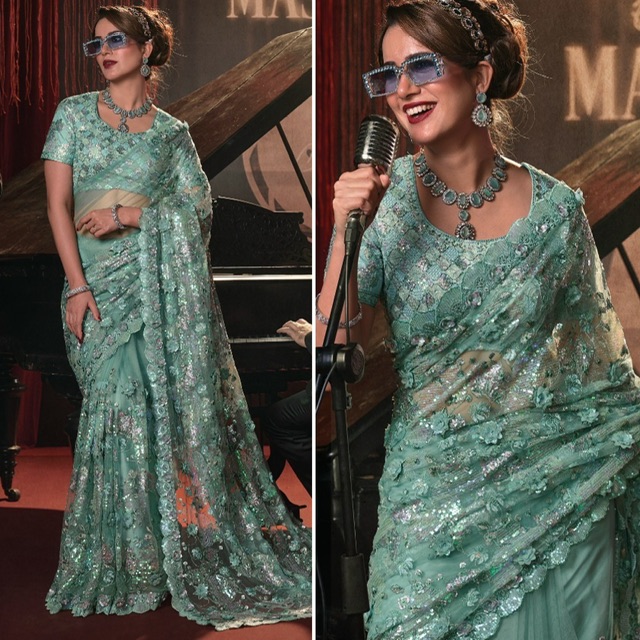 SEA GREEN DIGITAL NET SAREE WITH SEQUENCE & FLOWER APLIC HEAVY WORK – UNSTITCHED BLOUSE