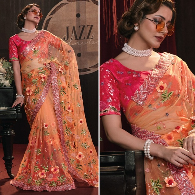 ORANGE SHADDED DIGITAL NET SAREE WITH