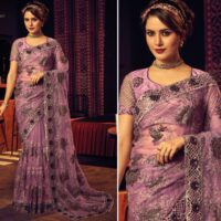 PINK DIGITAL NET SAREE WITH JARI, REXINE PATCH,ZARKAN & SEQUENCE FLOWER HEAVY WORK