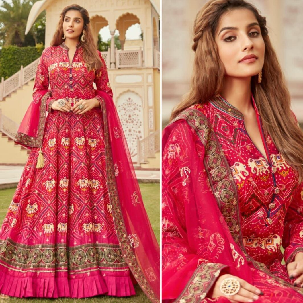 New designer ready made pure dola jacquard silk bandhani gown