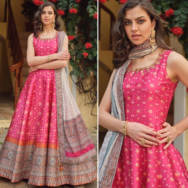 New designer ready made silk patola print gown with neck embroidery work