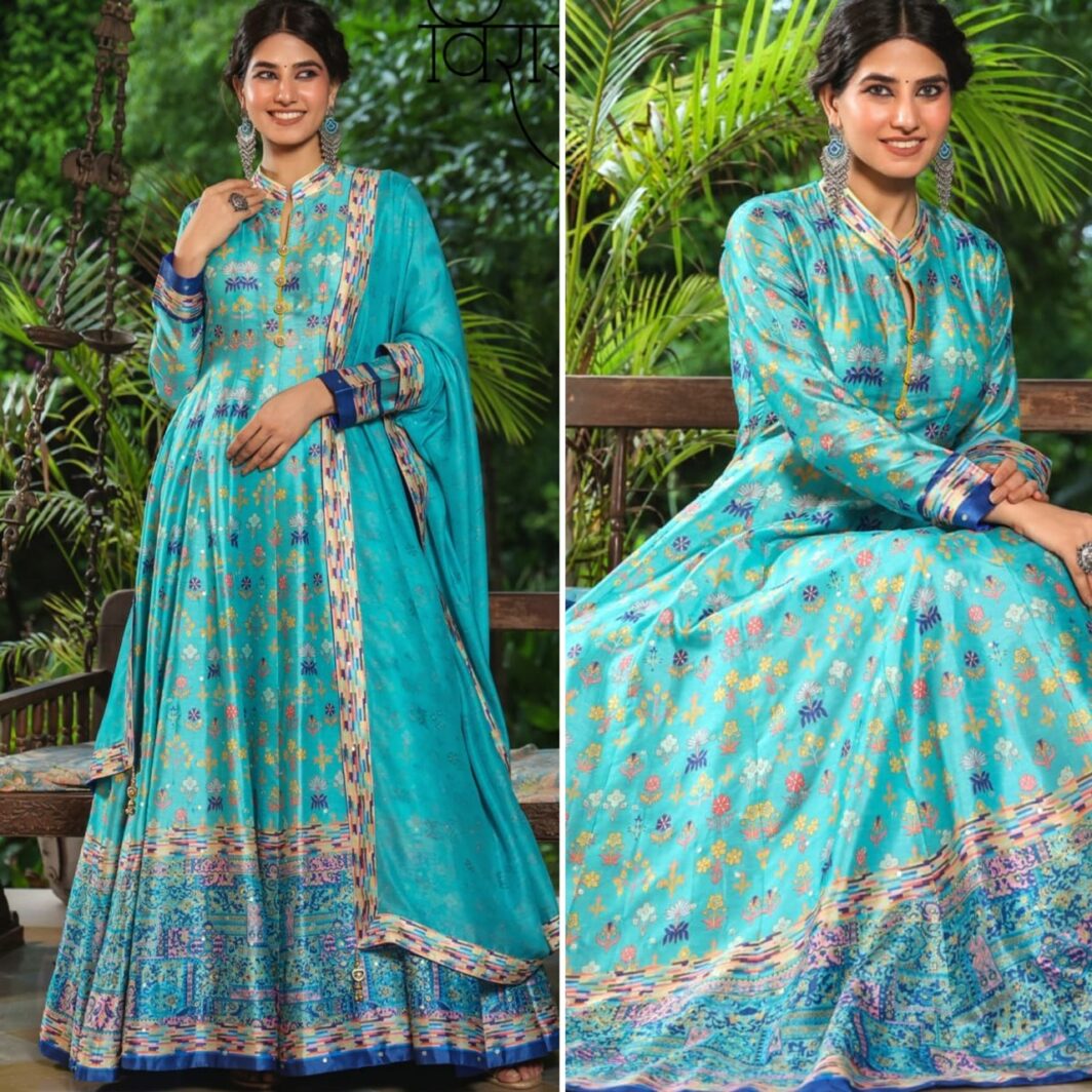 New designer silk gown with digital print and embroidery work
