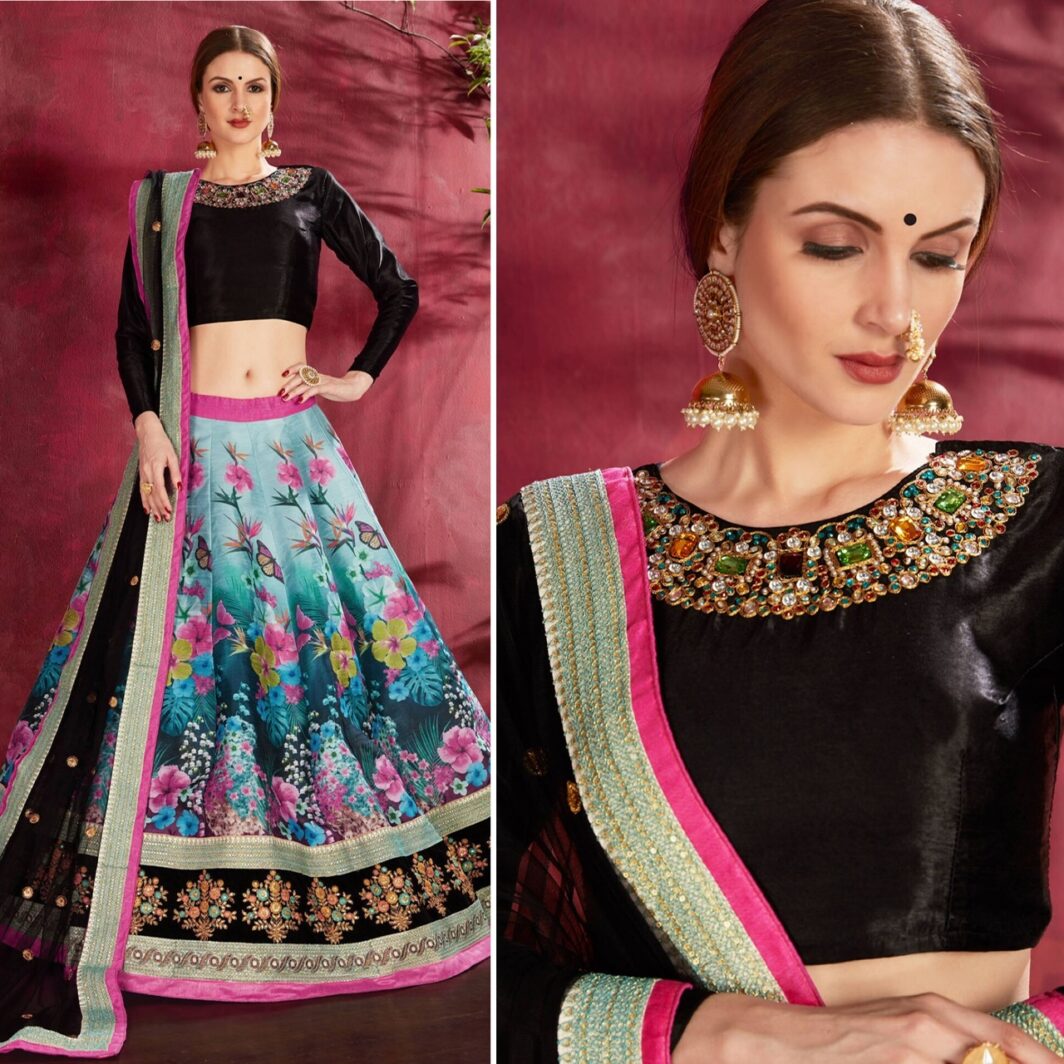New designer bangalori silk lehenga with floral print, dori, sequin and zari embroidery work