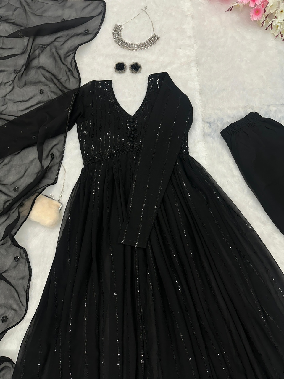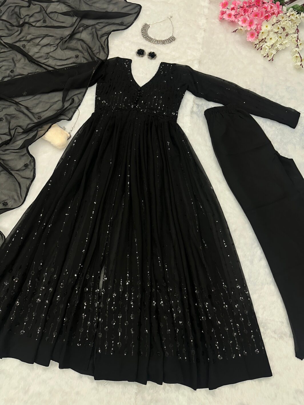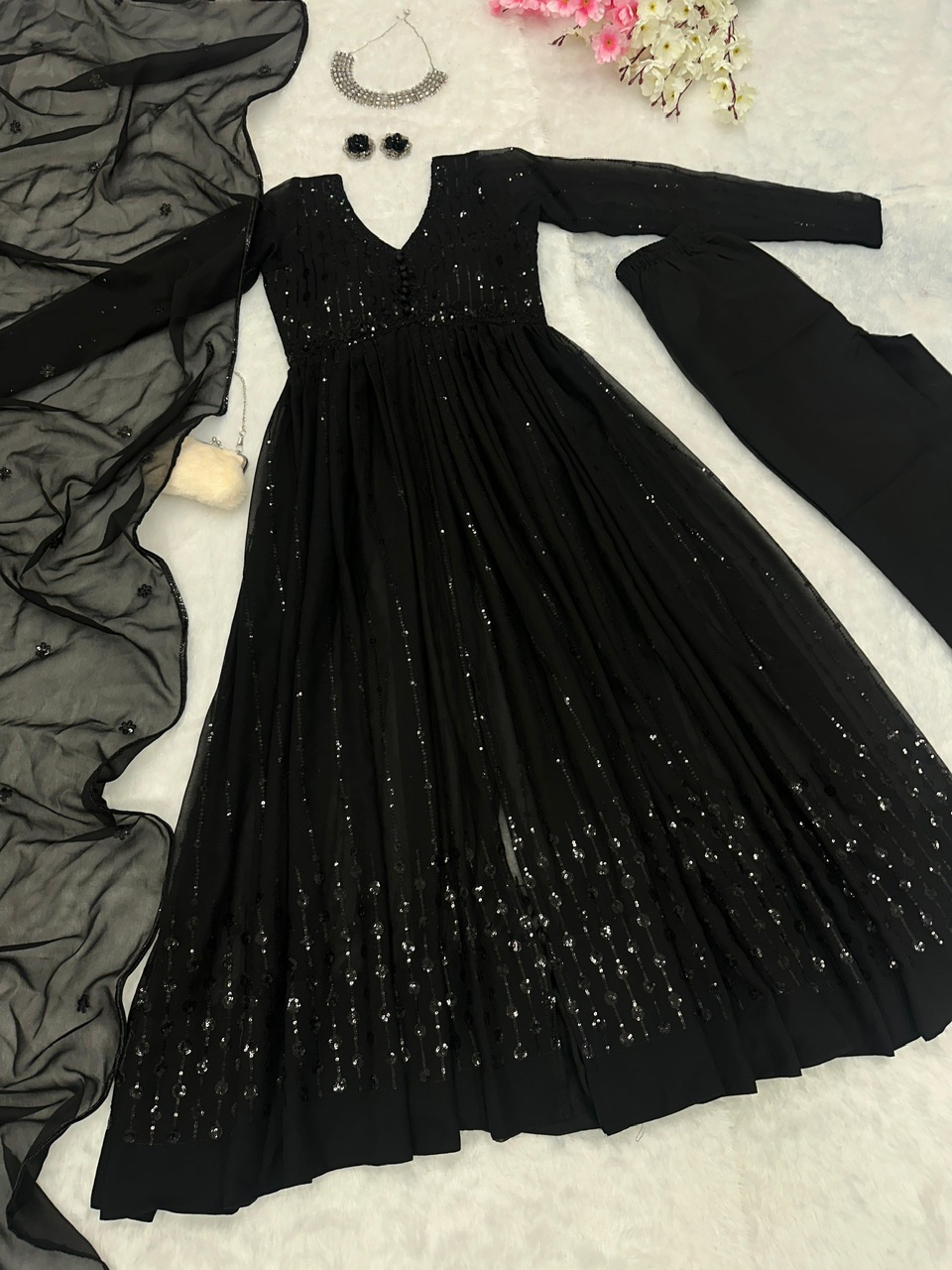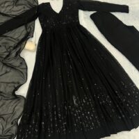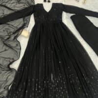 New bollywood wardrobe team ready made georgette front slit anarkali suit with sequin embroidery work and lace border