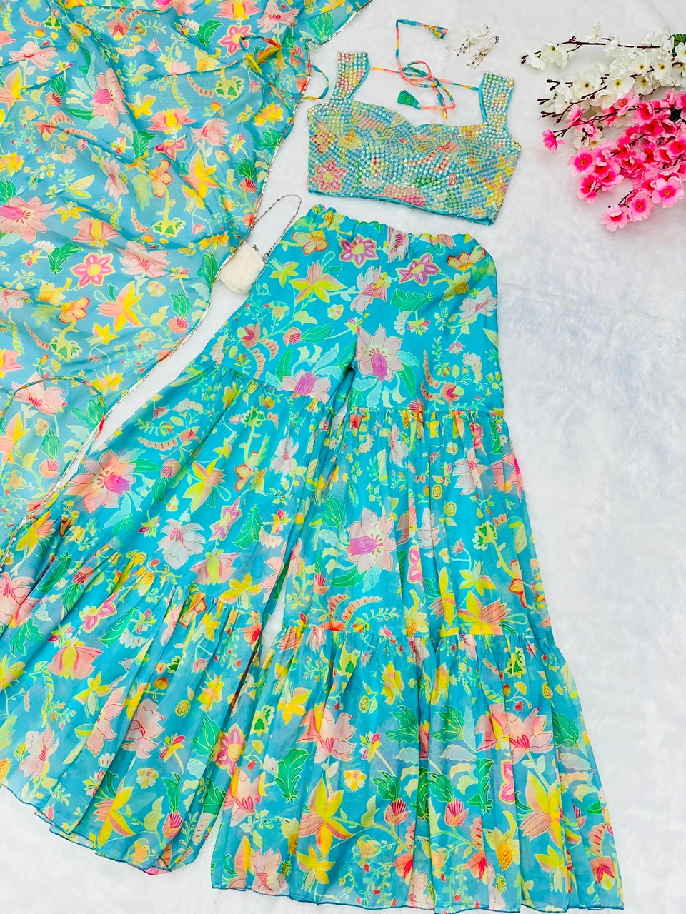 New Bollywood wardrobe team organza silk ready made suit with digital print and pearl/sequin work blouse