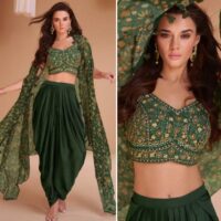New designer limited edition ready made satin silk dhoti suits with mirror work blouse and soft organza silk shrug