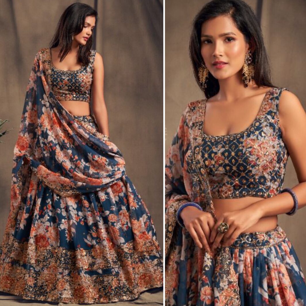 New designer soft organza silk digital printed lehenga with sequins embroidery – skirt comes semi stitched max 42 inches and blouse unstitched with 16 inches arms material