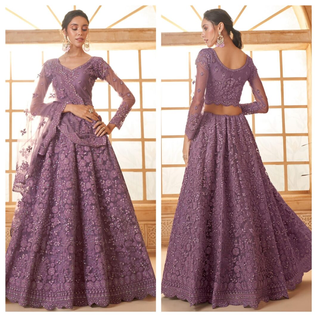 New designer soft net lehenga with stone, thread and coding embroidery work