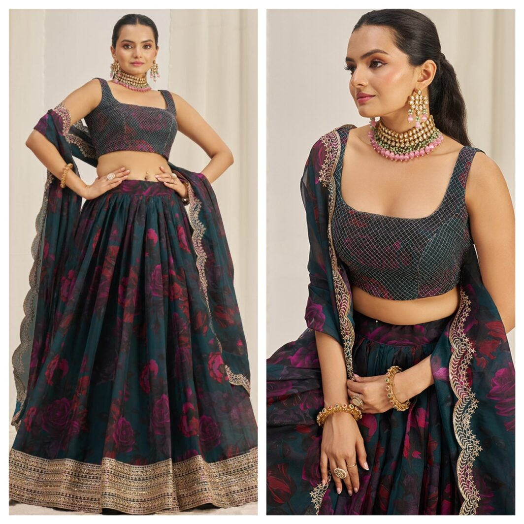 Be the first to review “TEAL FLORAL ORGANZA SILK LEHENGA READY TO DISPATCH ARY328”