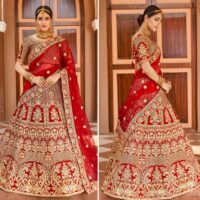 New red bridal velvet lehenga with heavy embroidery work – skirt semi stitched max 42 inches waist and blouse unstitched