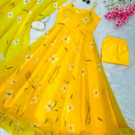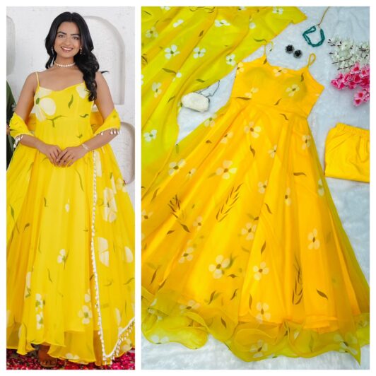 YELLOW ORGANZA SILK READY MADE ANARKALI STYLE GOWN PREORDER SPECIAL SC161A